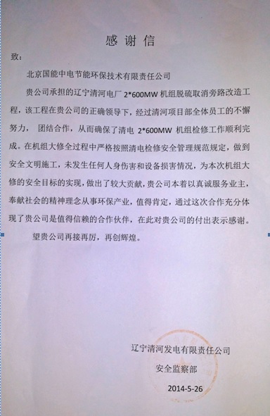 在公司總部的正確領導下,經(jīng)過遼寧清河電廠2*600MW機組脫硫取消旁路改造工程項目部全體員工的共同努力,確保了該工程業(yè)主安全目標的順利實現(xiàn),受到業(yè)主公司安全監(jiān)察部表揚,也充分體現(xiàn)了我們國能中電是值得信賴的合作伙伴。
