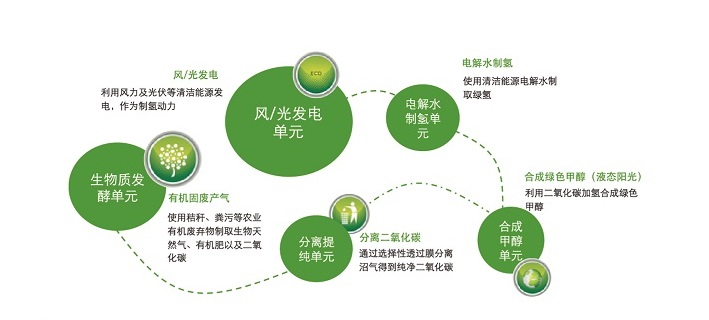 風(fēng)光生物質(zhì)聯(lián)合制儲氫(液態(tài)陽光)一體化碳中和技術(shù)是國能中電以國家“雙碳”目標為指引,在自身優(yōu)勢的生物質(zhì)能技術(shù)基礎(chǔ)之上,打破產(chǎn)業(yè)壁壘,融通產(chǎn)業(yè)鏈條,成功孵化的以風(fēng)能、太陽能、生物質(zhì)能、氫能等清潔能源為代表的一體化碳中和項目,該項目主要包括風(fēng)力發(fā)電單元、電解水制氫單元、生物質(zhì)發(fā)酵產(chǎn)氣單元、合成甲醇單元,在消納秸稈等有機固廢的同時,利用清潔能源為氫能產(chǎn)業(yè)提供綠色甲醇,通過能源循環(huán)利用最終實現(xiàn)碳中和。該項目建立了全新的清潔能源產(chǎn)業(yè)鏈協(xié)同利用模式,是國能中電碳中和路徑的有益實踐,也是我國能源結(jié)構(gòu)重整的創(chuàng)新之舉。